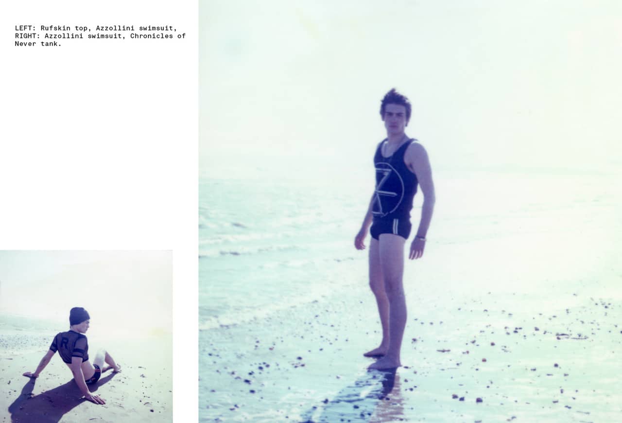 Two models showcase stylish swimsuits on a beach.