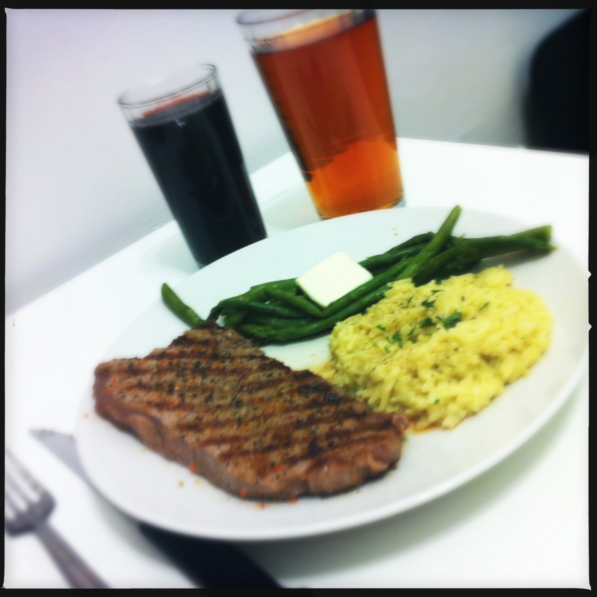 NY-strip, butter herbal rice, asparagus, wine, iced tea! Mmm