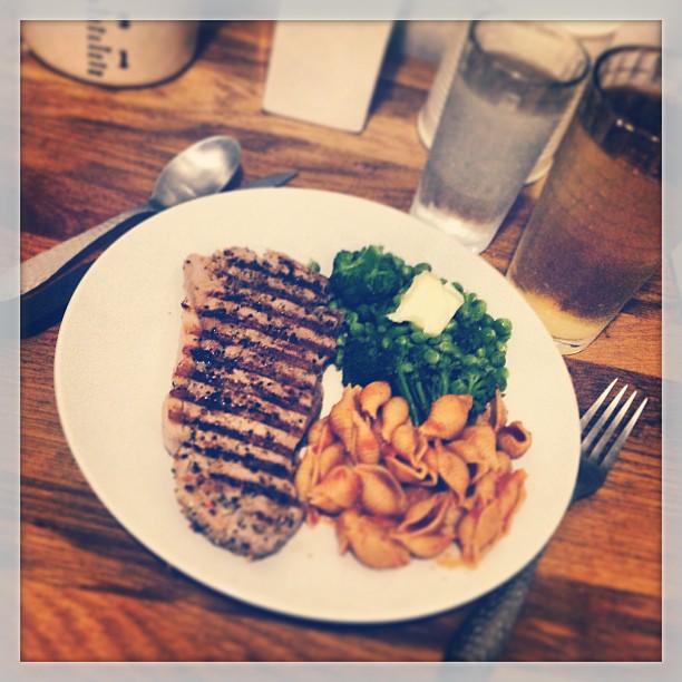 Herb crusted steak, shell pasta with tomato sauce, home grown pea & broccoli medley. | Read Insta-comments -> http://bit.ly/14rwvcl