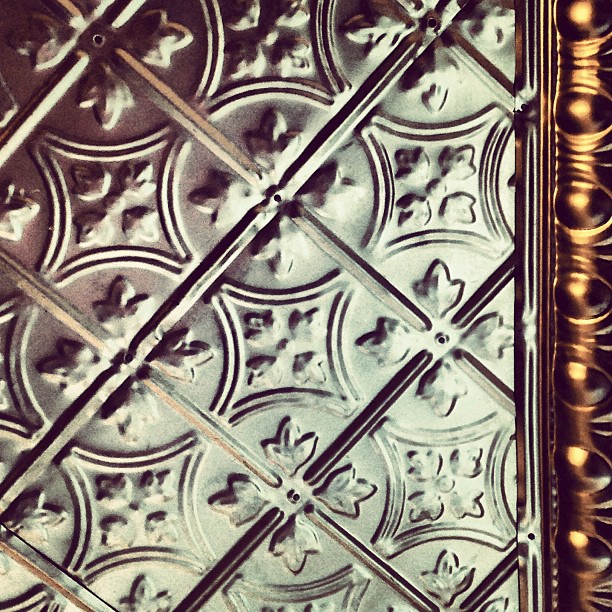 Vintage tin ceiling tiles with intricate floral patterns.