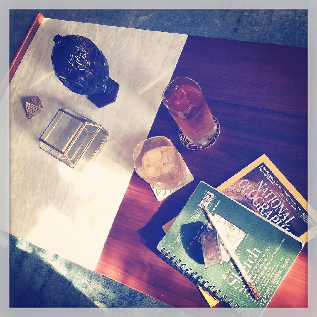 Tea and Whiskey Feeling Nifty could be a whole mood, but it also fits this little still life: two glasses catching the light, a cool slab of marble cutting through warm wood, and a small stack of paper—National Geographic and a sketchpad—waiting like an unfinished sentence. The room doesn’t demand attention. It just holds it.