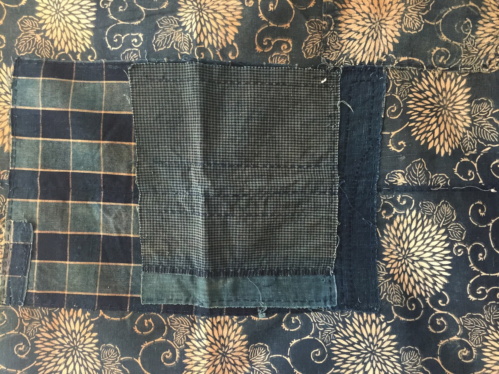 I was fortunate enough to purchase two pieces from Sri, each hand loomed and indigo dyed and created in the early 20th century. The longer, Boro piece would have been used for bedding and has a chrysanthemum print. The square piece would have been used for bundling and has the Oda melon flower at the corner. It was created using the technique called katazome (stencil paste dye).
