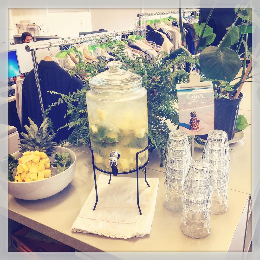 This was the last Club Monaco spa water: a glass dispenser filled with pale citrus and leafy greens, set on a table that’s doing its best to look effortless. Nearby, stacks of clean glasses catch the light. A bowl of pineapple sits open and bright, like summer cut into bite-sized pieces. Behind it all, clothing racks crowd the background—soft fabric, hangers, a little bustle—while the plants lean in as if they belong to the scene as much as the people do.