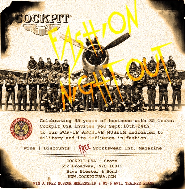 FASHION NIGHT OUT NYC 2010 – Cockpit USA All art work for this event was created by me Zachary A. Martz Celebrating 35 years of business with 35 looks; Cockpit USA invites you Sept: 10th-24th to our POP-UP ARCHIVE MUSEUM dedicated to military and its influence in fashion. via(Cockpit USA)