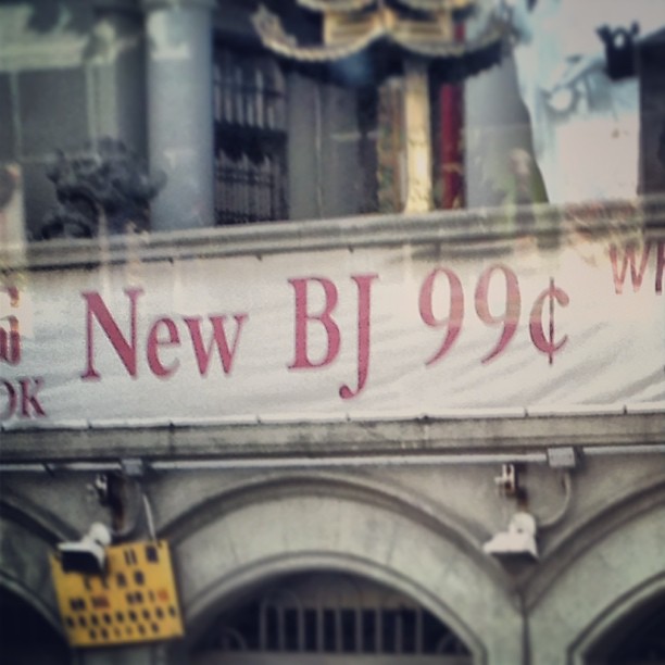Sign for New BJ store offering items at 99 cents.
