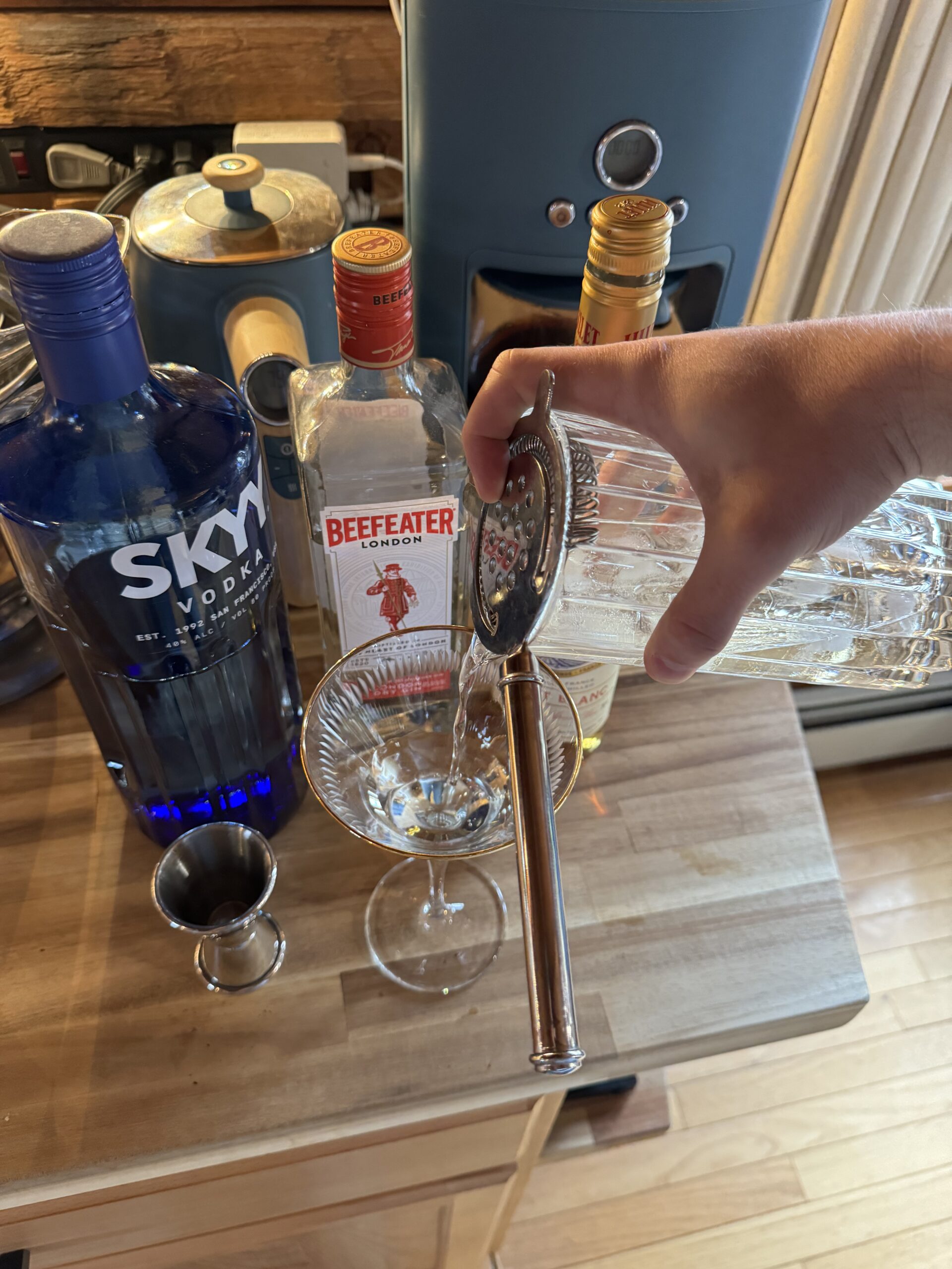 - Strain – Discard the ice or water in your martini glass, and strain the cocktail mixture into the glass.